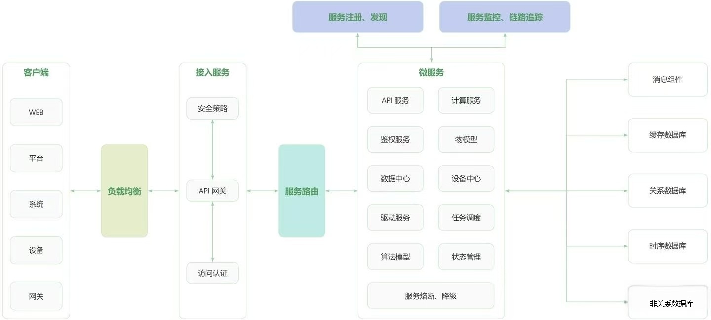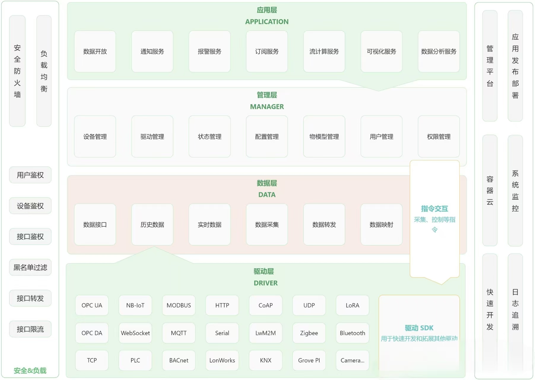 DC3平台是基于Spring Cloud架构开发的,是一系列松耦合、开源的微服务集合。 微服务集合由 4 个微服务层和两个增强的基础系统服务组成,提供从物理域数据采集到信息域数据处理等一系列的服务。
